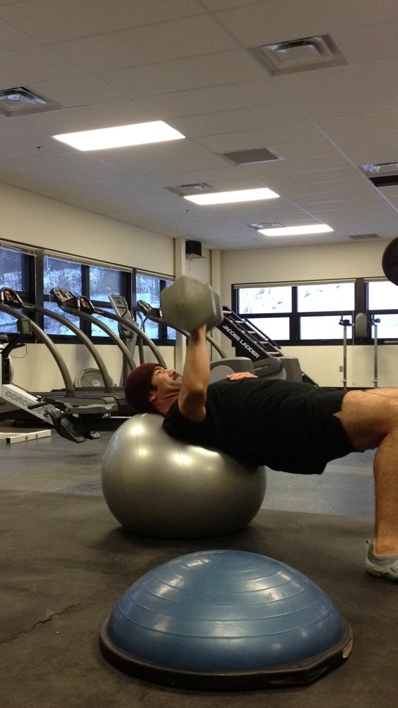 I’ve tweaked the bench as well. I’m back to doing one-armed presses on the Bosu Ball, final sets are capping out at 5 @ 100lb dumbell.