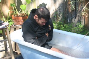 which helps move good stuff in and bad stuff out). In college, I took an ice bath every day, and when the runners showed up to the training room, the ball players and other athletes took off since they knew we were going to turn the cold bath Arctic by dumping a ton of ice in. These days, I have less of a tolerance for 37 degree baths, as evidenced by the photo on the right, but I’ve always heard the 50 degrees or so is about what you need to max out the effects. Just don’t try telling Whitis that…that’s his Dr Torquemada take on an ice bath I’m grimacing my way through in the picture.