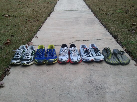 Minimal shoes are characterized by varying lightness and degrees of heel-toe drop in the midsole. While non-minimal shoes run an excess of 10-12 oz a shoe, and 10-15mm of heel-toe drop (think of a down-sloping ramp due to there being more cushioning in the heel than in the forefoot), most minimal shoes start around 9 oz or less, and offer anywhere between 0-9mm of heel-toe drop. The heel-toe drop thing is important because the less gradient there is, the easier it is for you to foot strike in your stride midfoot/forefoot. Anyway, the shoes you see above run from less to more minimal from left to right. The Brooks Launch are the shoes I wear when I feel pretty beat up, sore calves, achilles, etc. The next two, The Mizuno Wave Musha 2, and the Saucony Kinvara are my workhorse shoes. I do most of my regular runs in them. The Saucony Grid A4 are next – those are my speed work/racing flats. Both the Kinvara and the A4 run a 4mm heel-toe drop, and are both very light. Last on the right are my Vibram Five Fingers, which are as close to barefoot as you can get. They’re basically slippers with articulated toes. I do all my strength work in them, and try to do a couple 3-5M runs a week wearing them.